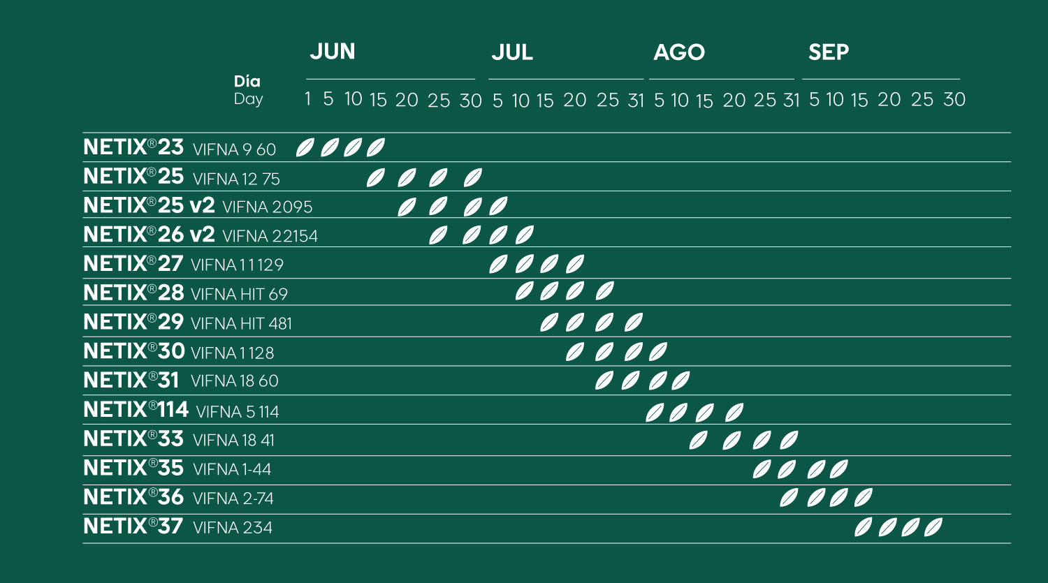 El vivero de frutales de Augusta Viveros, especialistas en árboles frutales a raíz desnuda, tiene un gran número de variedades de nectarinas exclusivas de ViF International. Dentro de las variedades de Nectarina, destacan el grupo Netix® de carne amarilla. Los frutos tienen una carne dura y crujiente confiriéndole un gran aguante en árbol, con un gran potencial agronómico.